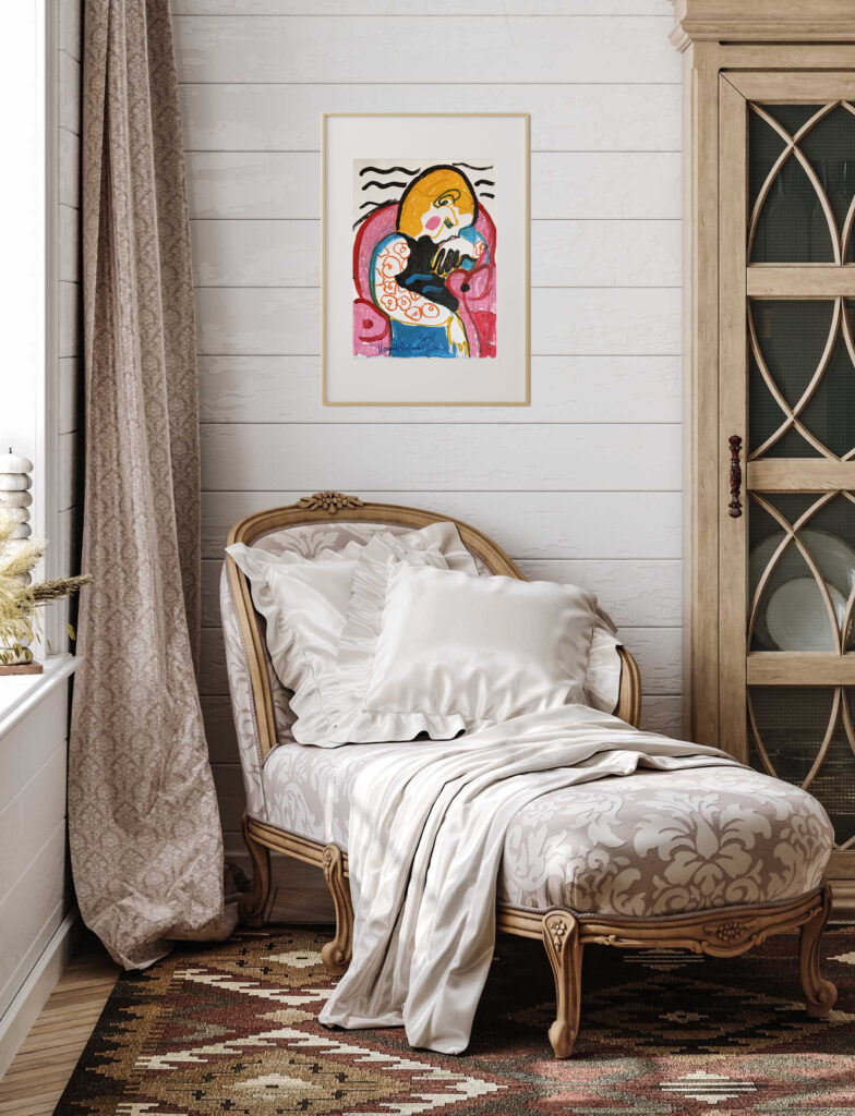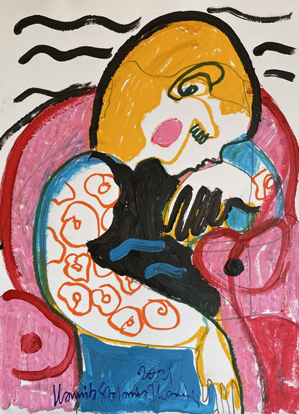 ‚In a pink armchair’, oil pastels, acrylic, 40 x 30, Kamila Stefania Tkaczyk 2021