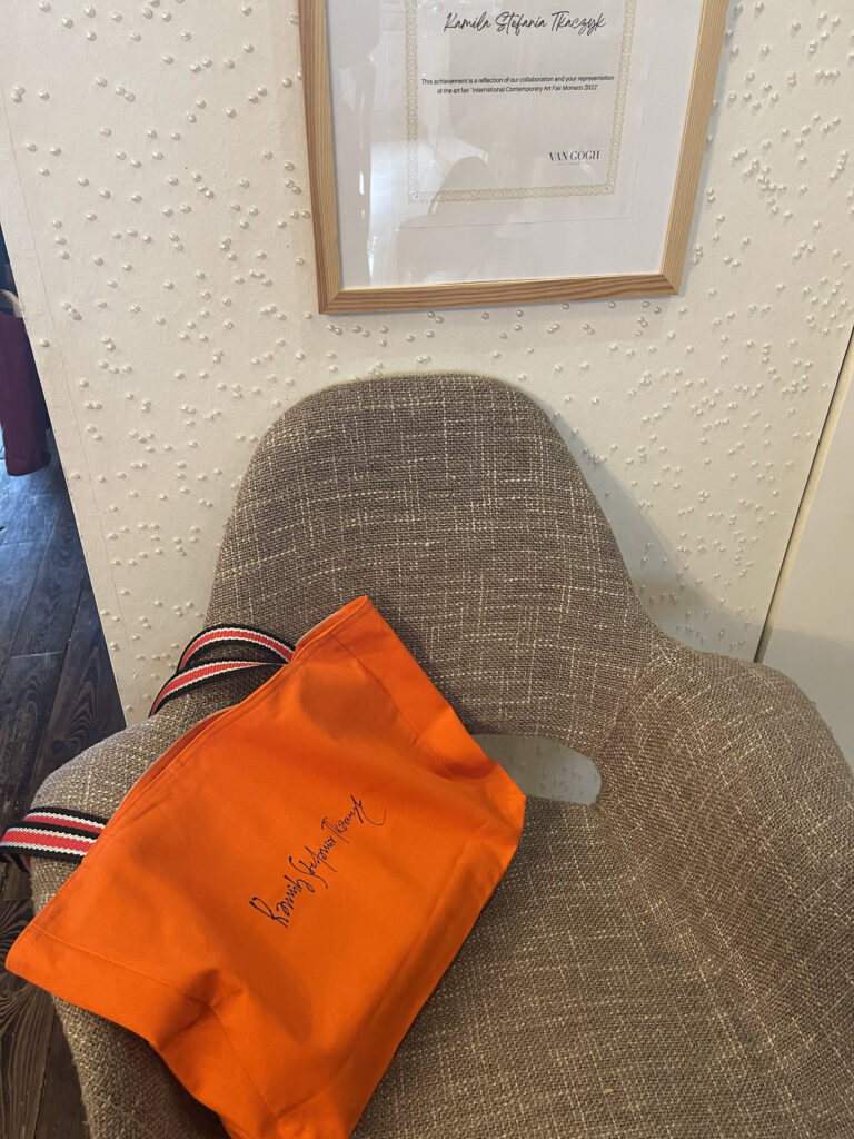 Artystyczna torba, 100 % bawełna, by Kamila Stefania Tkaczyk. Unikatowa, jak dzieła, które są naniesione w formie pracochłonnego wydruku. Limited edition, hand made. Tył to pomarańcz.