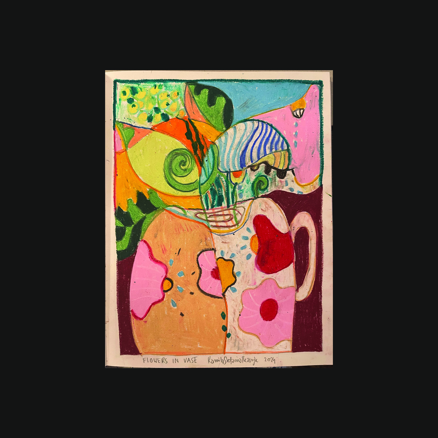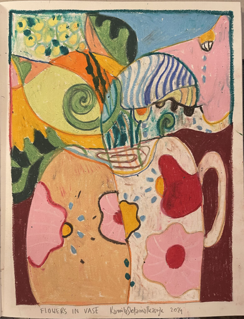 ‚Flowers in vase’, oil pastels, A3, Kamila Stefania Tkaczyk 2024.