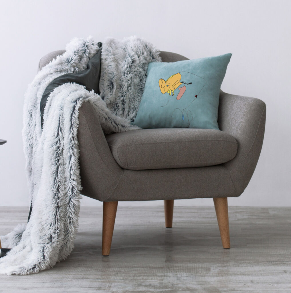 Minimalist home workspace design. Modern armchair with blue pillow and soft plaid, next to small table with laptop in scandinavian interior with light wall, empty space for ad, flat lay, panorama