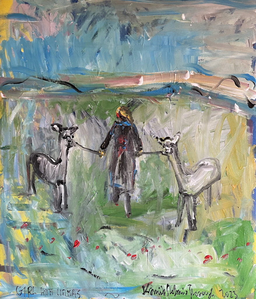 ‚Girl with liamas’, acrylic, 60 x 50 cm, Kamila Stefania Tkaczyk 2023.