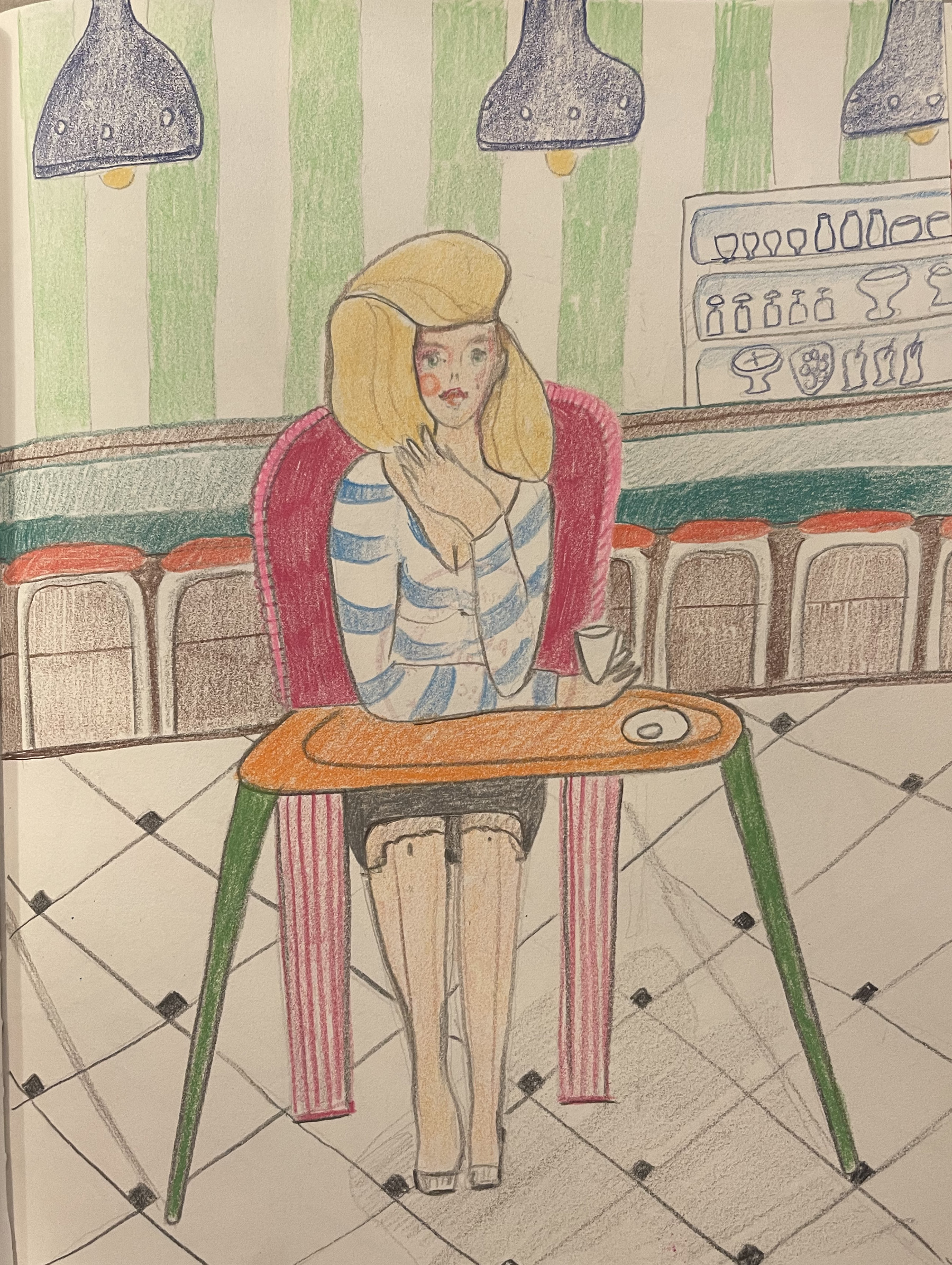 ‚In bar’, crayons, A3, Kamila Stefania Tkaczyk 2024.