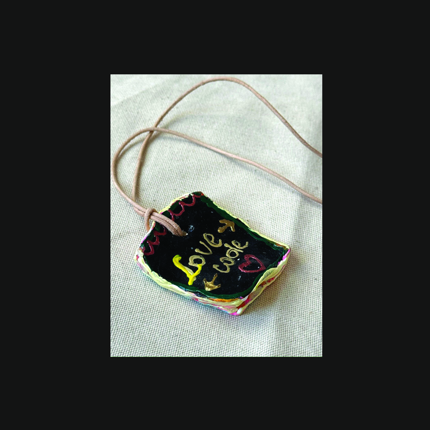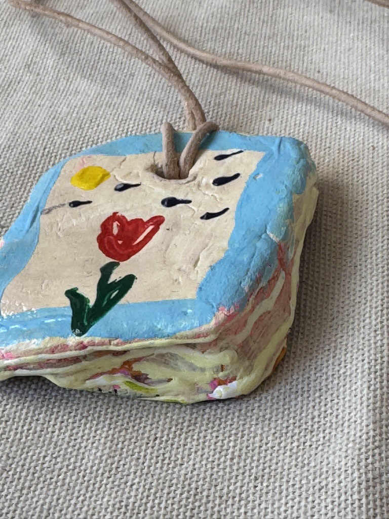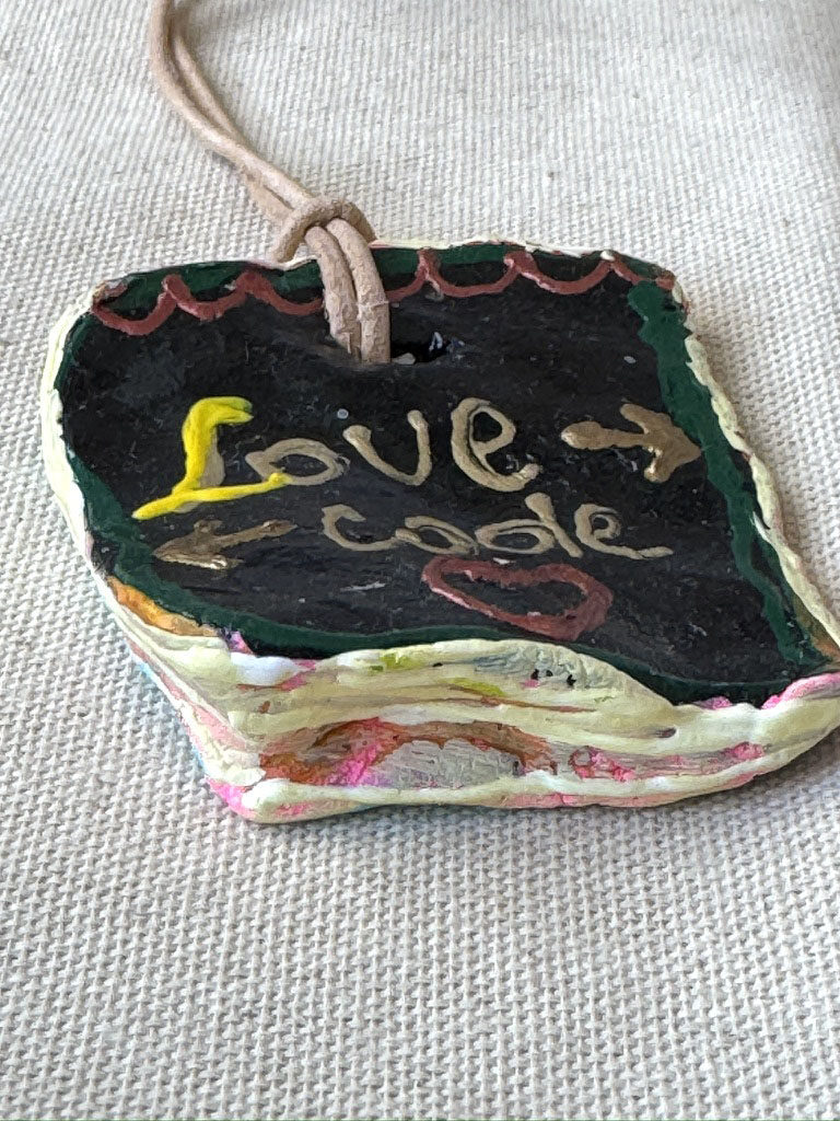 A finely crafted artistic necklace made of clay. Painted on both sides, suspended on a leather strap. In the box, a Marseille soap and a hand-painted unleavened cotton bag. Art & design Kamila Stefania Tkaczyk. Limited edition. Sales and contact via email: kamila.tkaczyk.art@gmail.com