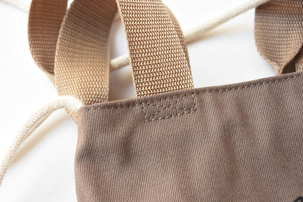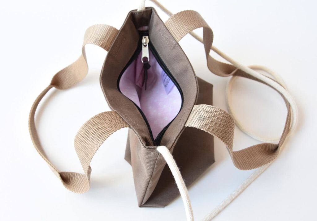 Mała torebka w kolorze cappuccino, piaskowe uszy, naturalny biały sznurek, czarny suwak, środek różowa bawełna w białe groszki. Sygnowana podpisem artystki.
