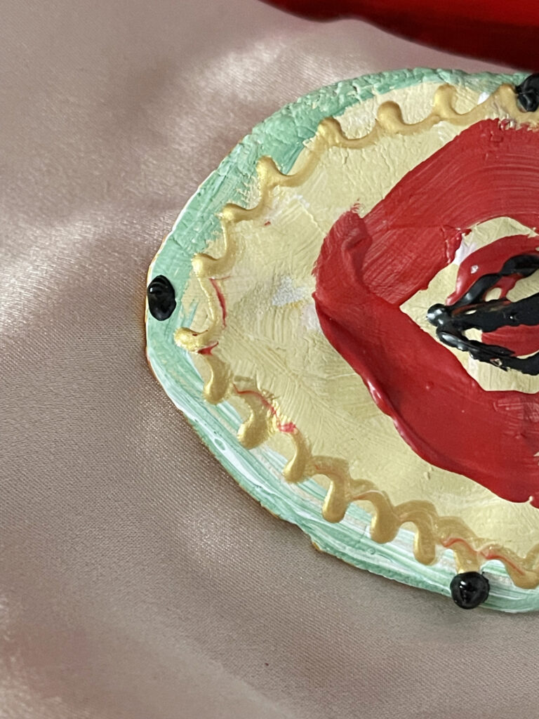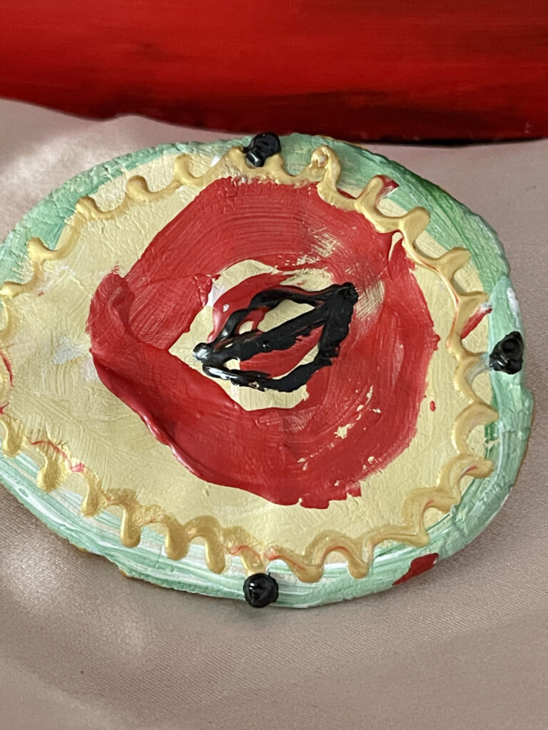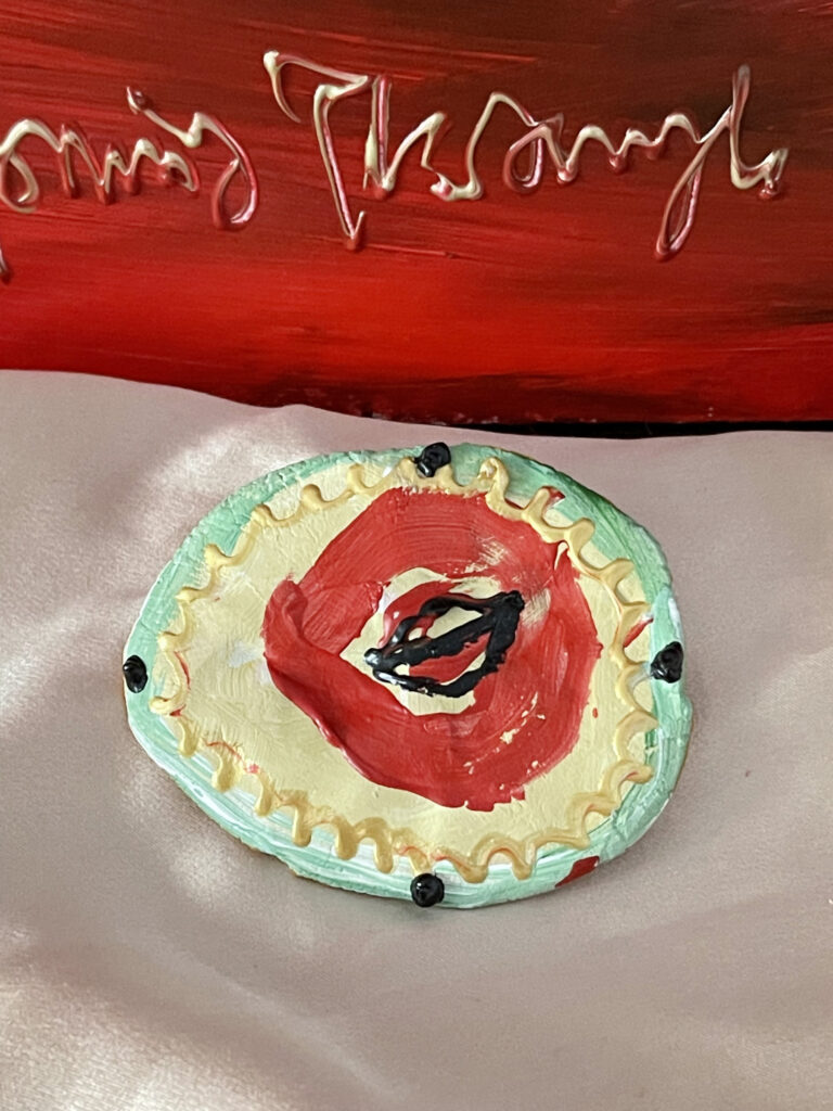 ‚Mouth’, brooch. Clay, acrylic, diameter 6 cm. Kamila Stefania Tkaczyk 2022