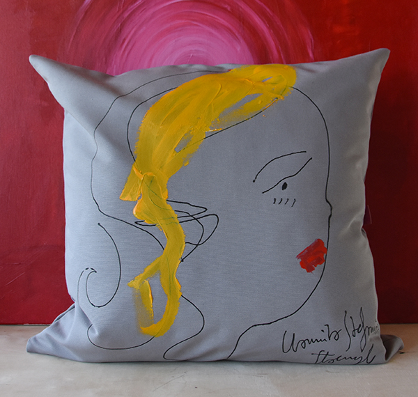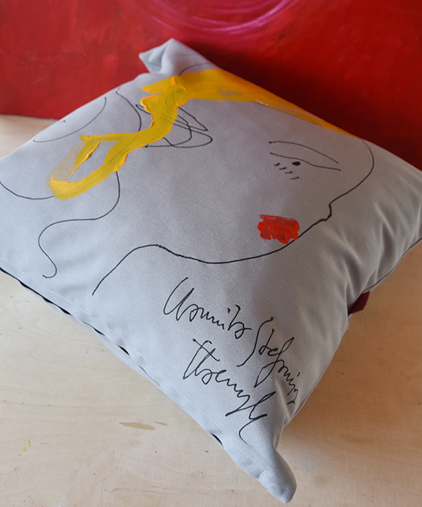 Poszewka na poduszkę projektu Kamili Stefanii Tkaczyk. Szara bawełna, obraz, wymiary 50 x 50 cm.