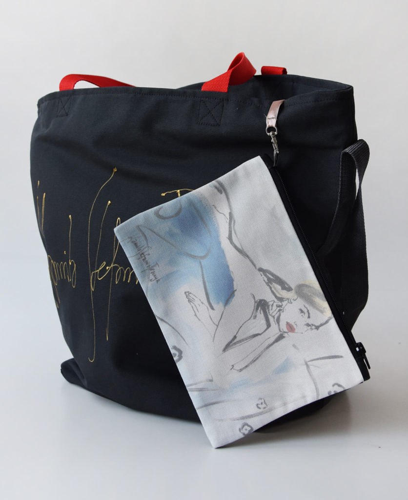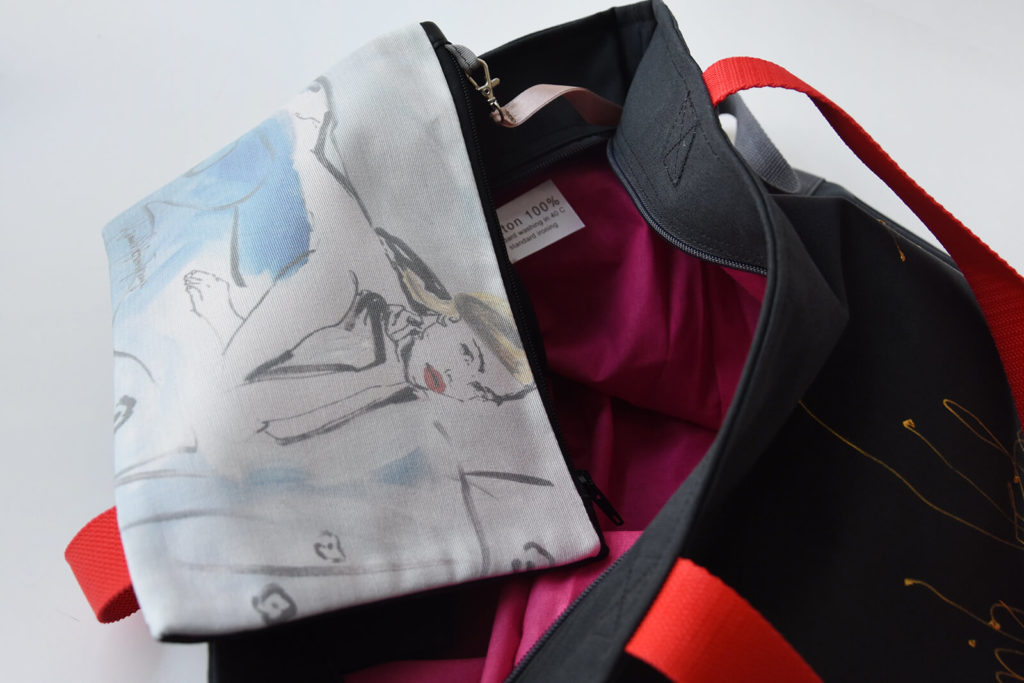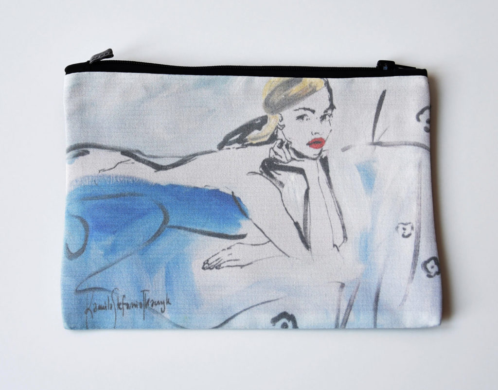 Przybornik-kosmetyczka z obrazem K.S. Tkaczyk ‚Prada poza’. Przedmiot uszyty ręcznie ze szczególną dbałością o detale. Saszetki są zapinane na suwak, wykończone naturalną skórką. Wewnątrz satyna bawełniana. Dzięki tasiemkowej pętelce można doczepić je do Shopperbag IKSEL.