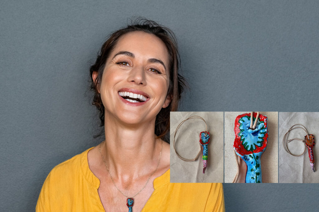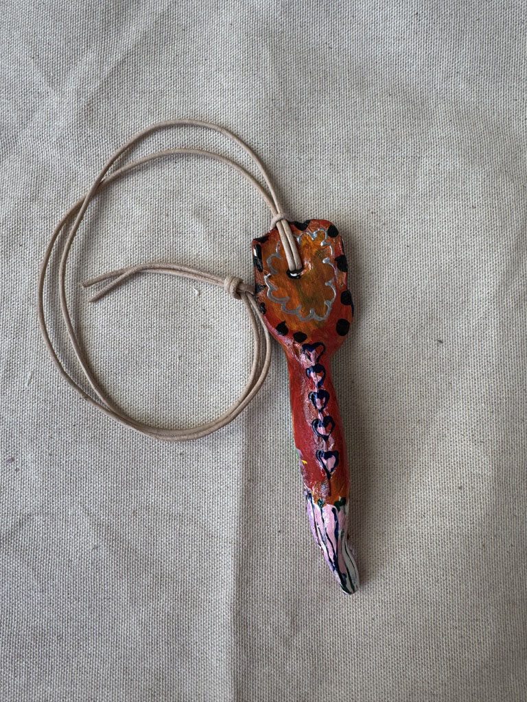 A finely crafted artistic necklace made of clay. Painted on both sides, suspended on a leather strap. In the box, a Marseille soap and a hand-painted unleavened cotton bag. Art & design Kamila Stefania Tkaczyk. Limited edition. Sales and contact via email: kamila.tkaczyk.art@gmail.com