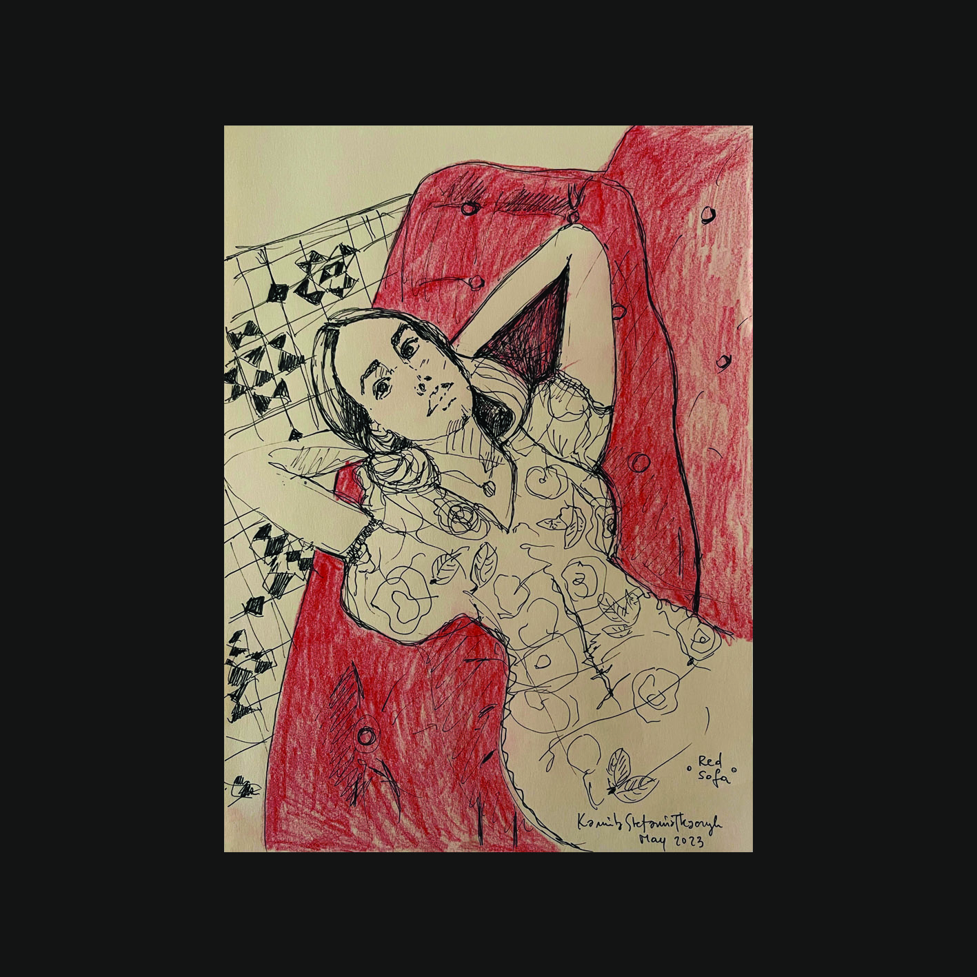 ‚Red sofa’, ink, A4, Kamila Stefania Tkaczyk 2023.