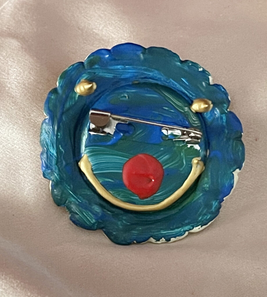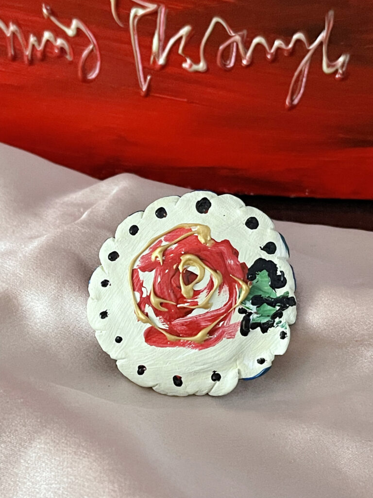 ‚Rose’, brooch. Clay, acrylic, diameter 5 cm. Kamila Stefania Tkaczyk 2022.