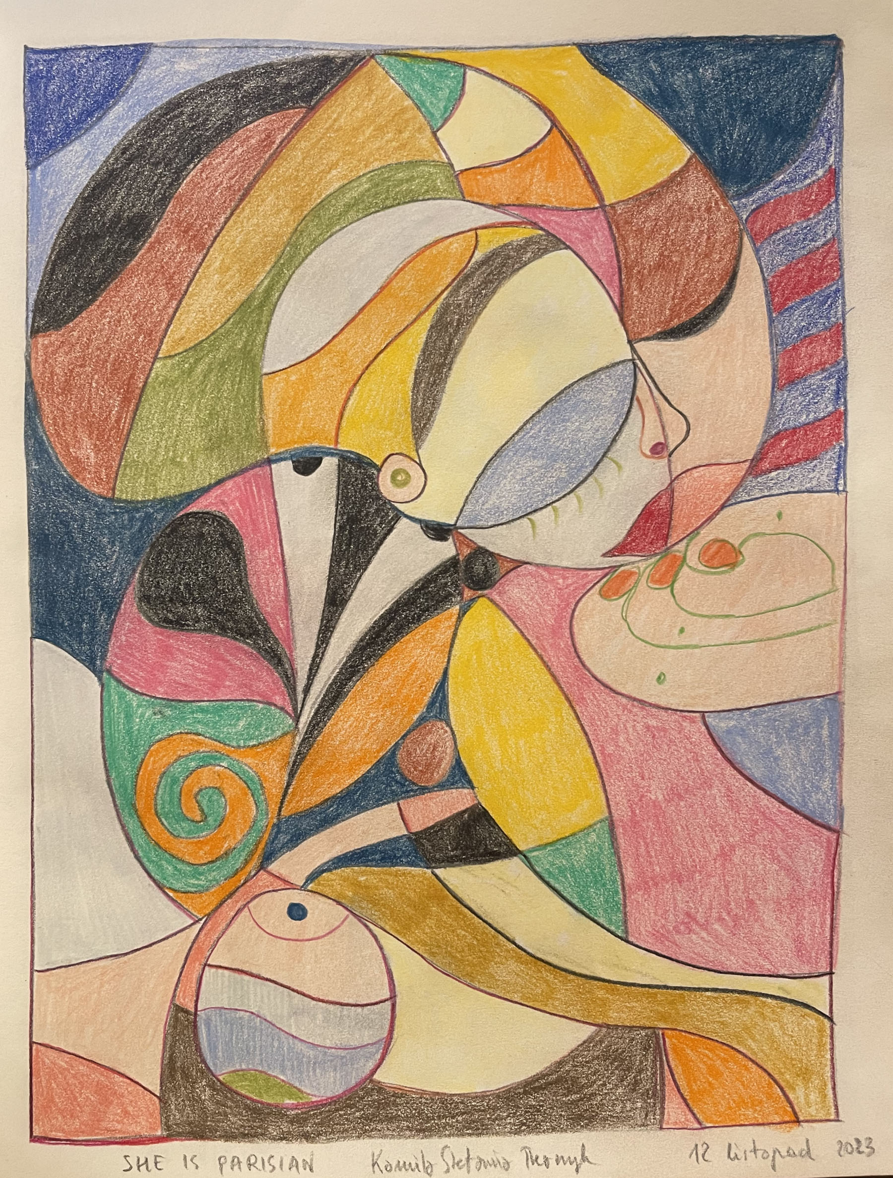 ‚She is Parisian’, polychromos crayon, 27,5 x 36,5 cm, Kamila Stefania Tkaczyk 2023.