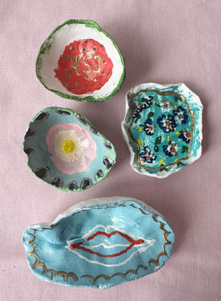 Few bowls made of clay and painted with special art paint. Protected with varnish. Packed in a box. Art and design by Kamila Stefania Tkaczyk. Purchase via kamila.tkaczyk.art@gmail.com