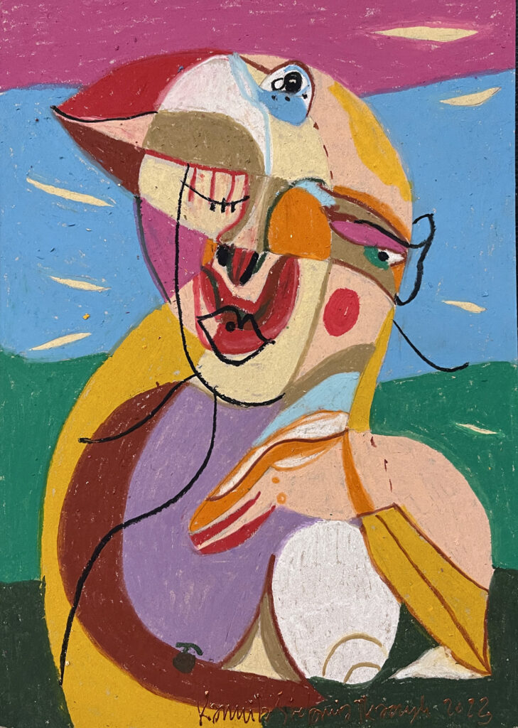 ‚Woman bird’, oil pastel, 50 x 35 cm, Kamila Stefania Tkaczyk 2023.